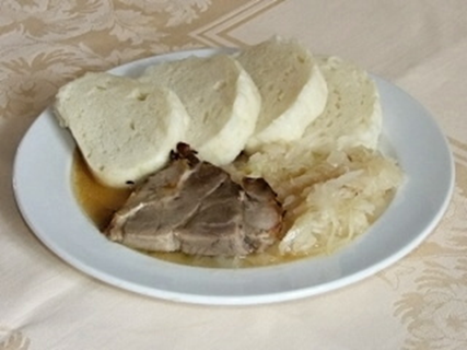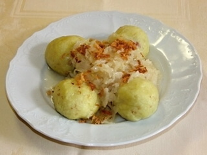 Bramborové knedlíky plněné uzeným masem, zelí |